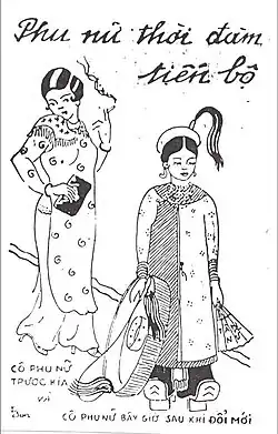 Huế's Đồng Khánh Girls' High School, which opened in 1917, was widely praised for the áo dài uniform worn by its students.[17] The first modernized áo dài appeared at a Paris fashion show in 1921. In 1930, Hanoi artist Cát Tường, also known as Le Mur, designed a shirt inspired by the áo ngũ thân and by Paris fashions. It reached to the floor and fit the curves of the body by using darts and a nipped-in waist.[18] When fabric became inexpensive, the rationale for multiple layers and thick flaps disappeared. Modern textile manufacture allows for wider panels, eliminating the need to sew narrow panels together. The áo dài Le Mur, or "trendy" ao dai, created a sensation when model Nguyễn Thị Hậu wore it for a feature published by the newspaper Today in January 1935.[19] The style was promoted by the artists of Tự Lực văn đoàn ("Self-Reliant Literary Group") as a national costume for the modern era. The painter Lê Phô introduced several popular styles of ao dai beginning in 1934. Such Westernized garments temporarily disappeared during World War II (1939–45).
