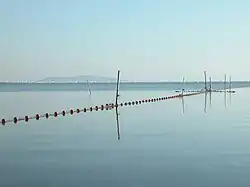 As the lagoon is open to the sea, it has fish such as the gilt-head bream (dorade), the meagre (maigre, a kind of croaker) and the sea bass.[4] The lagoon produces approximately 200 kg/ha/year of fish.[4] However, the shellfish industry is more economically important.[5] Eighteen varieties of shellfish are taken from the lagoon - the most important being oysters. 750 producers farm 2,750 oyster tables and take some 13,000 tonnes annually. This provides for about 8.5% of France's consumption. Oysters from the Étang de Thau are marketed under the name huîtres de Bouzigues (Bouzigues oysters) after the village of Bouzigues where oyster production started. They are a cupped variety.[6] Fixed with cement to ropes, the young oysters are immersed in the water until they reach a size suitable for consumption. Thau water is graded A and so shellfish can be caught and consumed within minutes. In addition to oysters, some 3,000 tonnes of mussels are produced every year.
