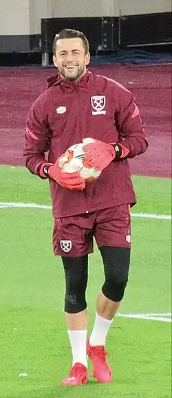 In July 2022, he signed a further contract extension, until the summer of 2023.[46] On 19 October 2022, he made his 150th West Ham United appearance, in a 1–0 Premier League defeat at Liverpool. After having started all 24 of West Ham's Premier League games in the 2022–23 season, on 25 February 2023 he fractured his cheekbone and eye socket in a home game against Nottingham Forest. He had to come off in the 69th minute and was replaced by Alphonse Areola.[47] During the season he started 36 Premier League matches and kept ten clean sheets. He also made one FA Cup appearance, his first since their relegation 2020–21 season. Fabiański saved two penalties during the season, from Leicester City's Youri Tielemans and from Bukayo Saka of Arsenal. During the season he started 36 Premier League matches and kept ten clean sheets. He also made one FA Cup appearance, his first since the 2020–21 season.[48] On 7 June 2023, he was an unused substitute as West Ham won the 2022–23 Europa Conference League beating Fiorentina in Prague.[49]