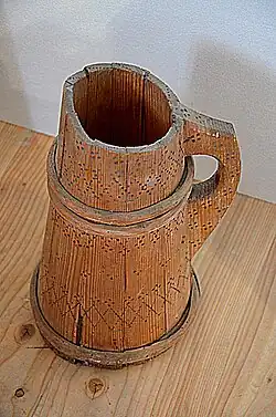 A dyngus procession would also be held, either on Easter Monday or Tuesday. A parade of boys would take part in a march known as chodzenie po dyngusie – "going on the dyngus" – or z kogutkiem – "with the cockerel", a reference to the use of a live bird, usually taken without permission and stuffed with grain soaked in vodka to make him crow loudly. (A decorated and carved wooden rooster was sometimes used as an alternative.) The rooster was a symbol of fertility, carried on a small two-wheeled wagon which had been painted red and decorated with ribbons and flowers, to which was often also added small puppets representing a wedding party. This would be pushed from door to door by the boys, who would crow like roosters and sing dyngus songs conveying good wishes and requests for gifts and food.[19] Their objective was to encourage the inhabitants to give them food from their Easter tables, such as Easter eggs, ham and sausages.[20] A typical dyngus song went: