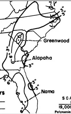 Across the Southeastern United States, the storm deposited heavy rainfall from Florida through southern Virginia, including a peak total of 11.70 in (297 mm) in Greenwood, South Carolina.[28] In Florida, a few locations observed sustained tropical storm-force winds, including 48 mph (75 km/h) in Titusville and 60 mph (95 km/h) in Cedar Key. According to a 1960 report by Gordon E. Dunn and Banner I. Miller, the cyclone caused "considerable damage at Micco."[7] Precipitation in Virginia ended a four-month drought in the state's Southside region. However, floodwaters inundated many corn and tobacco fields.[29] Farther east, the storm ruined crops and toppled some trees and buildings in Isle of Wight, Nansemond, and Southampton counties. The East Coast of the United States experienced gales as far north as Boston, Massachusetts.[7]