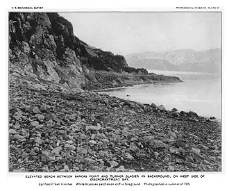 ![]() A raised beach in an area of Yakutat Bay, Alaska, uplifted by 47 feet in the 1899 earthquakes. The white patches on the cliff in the foreground are the remains of bryozoa, which would have been in the inter-tidal zone when alive. | |