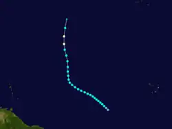 A low pressure area developed into a tropical storm about 835 mi (1,345 km) east-northeast of Barbuda early on September 23.[4][5] The system moved northwest, and by 12:00 UTC on September 24, it strengthened into a Category 1 hurricane. Late on September 25, the cyclone intensified into a Category 2 hurricane. A ship recorded a pressure of 971 mbar (28.7 inHg) on September 26. Because this was measured within the storm's radius of maximum sustained winds, the hurricane's minimum barometric pressure was estimated to have been 967 mbar (28.6 inHg). Based on the pressure-wind relationship, the system peaked with maximum sustained winds of 110 mph (175 km/h). Thereafter, it curved northeastward on September 27, shortly before weakening to a Category 1 hurricane. Early on September 28, the hurricane became extratropical about 360 mi (580 km) south-southeast of Sable Island. However, the extratropical storm existed until October 1, when it dissipated well north of the Azores.[5]