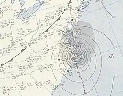 On August 29, a tropical storm developed over southern Florida.[8] While moving through the state, the storm dropped heavy rainfall, reaching 4.67 in (119 mm) at Fort Lauderdale Beach; similar rainfall was observed in the northern Bahamas. Described by one Weather Bureau forecaster as "wide and flat", the storm gradually organized over the western Atlantic Ocean.[20] On August 31, the storm turned to the northwest, with maximum sustained winds of 40 mph (65 km/h). The system weakened to a tropical depression before moving ashore near Savannah, Georgia on September 1. It dissipated that day over land.[8]