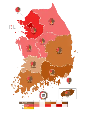 | Gyeongnam | 706,079 | (61.7%) | 341,971 | (29.9%) | 60,645 | (5.3%) | 19,323 | (1.7%) | 26,014 | (2.3%) | 1,144,032 | ![]() |
