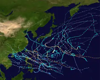 The 1967 Pacific typhoon season was one of the most active Pacific typhoon seasons on record, witnessing the formation of 35 tropical storms during the season. It began on January 1, 1967, though most storms usually form between June and December within the basin. The first storm of the season, Ruby, formed on January 28 west of the Philippines. The scope of this article is limited to the Pacific Ocean, north of the equator and west of the International Date Line. Storms that form east of the date line and north of the equator are called hurricanes; see 1967 Pacific hurricane season. Tropical depressions that are monitored by the United States' Joint Typhoon Warning Center (JTWC) were given a numerical designation with a "W" suffix, and any storms reaching 1-minute sustained winds of over 40 mph were given a name. Tropical depressions that enter or form in the Philippine area of responsibility are assigned a name by the Philippine Atmospheric, Geophysical and Astronomical Services Administration or PAGASA. This can often result in the same storm having two names.