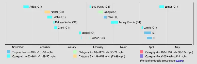 Audrey-Bonnie 1–9 Mar Category 2 tropical cyclone 110 (70) 975 Western Australia, Northern Territory Unknown Unknown
