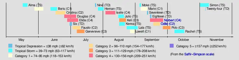 Norbert September 14–26 Category 4 hurricane 130 (215) Unknown Baja California, Sonora, Arizona $140 million 1 [3][17]