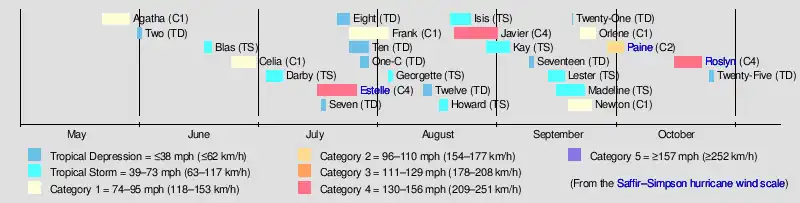The season began with the formation of Hurricane Agatha on May 22 and ended with the dissipation of Tropical Depression Twenty Five on October 25, spanning 147 days. Although it was nearly two weeks shorter than the 1985 Pacific hurricane season, the season was six days longer than average. The EPHC issued 406 tropical cyclone advisories, which were issued four times a day at 0000, 0600, 1200, and 1800 UTC. In 1986, hurricane hunters flew into three storms; Newton, Roslyn, and Estelle.[2][3] In Newton, the National Oceanic and Atmospheric Administration (NOAA) conducted environmental research in the cyclone. In addition, the National Weather Service Field Service Station provided the East Pacific with excellent satellite coverage.[2]