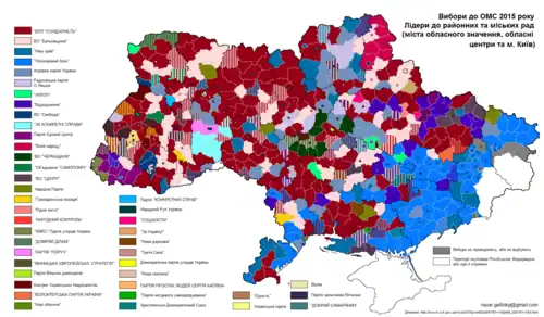 Week's milestones. Elections to be continued, blackmail in Minsk, and emotional lustration, UNIAN (27 October 2015) - ^ a b c d Central Elections Committee of Ukraine (2015). "Кандидати, яких обрано депутатами рад". WWW відображення ІАС "Місцеві вибори 2015" (in Ukrainian). Archived from the original on 13 November 2015. Retrieved 11 December 2023.