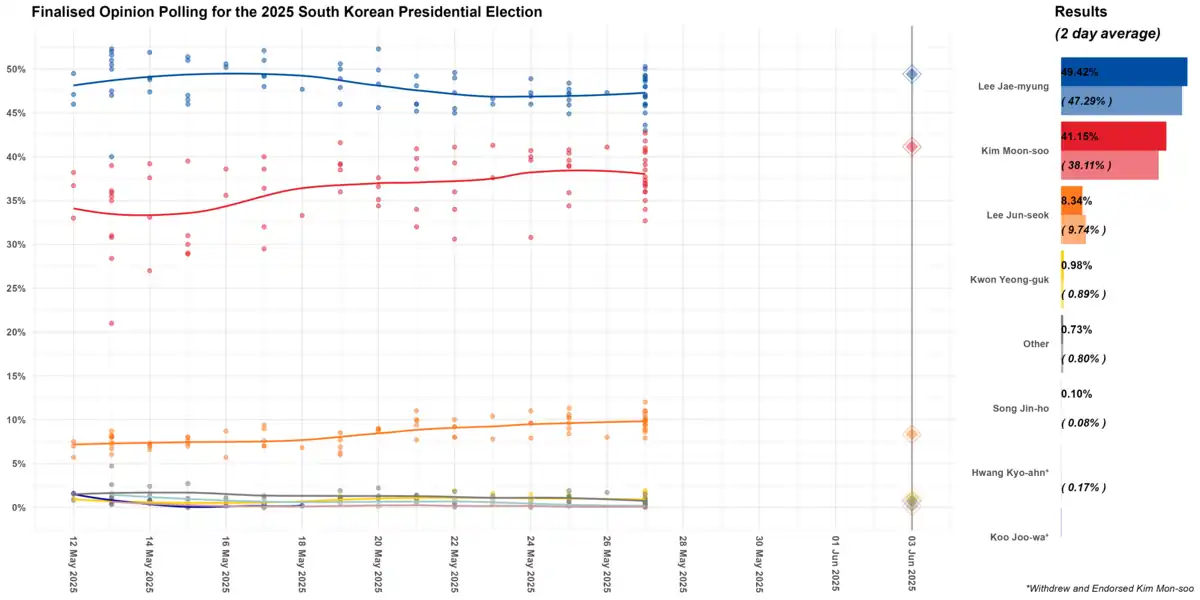 Early presidential elections were held in South Korea on 3 June 2025. Democratic Party nominee and former opposition leader Lee Jae Myung defeated the ruling People Power Party nominee Kim Moon-soo and Reform Party nominee Lee Jun-seok.