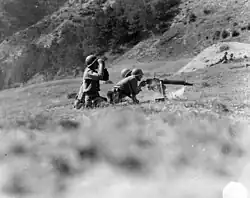 Machine gun crew of the 338th Infantry, 85th Division, firing at Germans carrying demolitions, 19 September 1944.