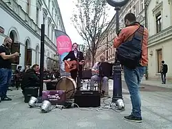 Since spring 2015, street music performances have been held at the intersection with Piotrkowska Street every spring, summer, and autumn as part of the Songwriter Łódź Festival. The first street concert was given by Peter J. Birch on 11 April 2015.[97][98][99] In 2015, 37 concerts were held, attended by 7,000 spectators.[100] On May 14 of that year, a dance flash mob took place in this spot, where Maciej Maślakiewicz, a member of the Czarne Stopy dance group, promoted his efforts to participate in workshops and performances on New York's Broadway.[101] The urban courtyard on 6 Sierpnia Street has become a cult place in Łódź, popular among residents and hosting many events.[89]
