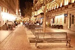 On 2 April 2014, work began on transforming the oldest section of 6 Sierpnia Street – between Piotrkowska Street and Tadeusz Kościuszko Avenue – into a woonerf, an urban courtyard inspired by urban planning solutions used in countries such as the Netherlands. The term woonerf was borrowed from Dutch by the proponents from the Normal City – Phenomenon Foundation and used for the first time in Łódź and Poland to refer to this type of urban space arrangement.[80][81][82] The renovation included replacing the asphalt surface with pavers and granite slabs, installing flowerbeds, benches, bicycle racks, an ornamental street clock, and planting five Kanzan cherry trees imported from Germany along the street. Additionally, parking spaces were designated, and this section was made a traffic-calmed zone. The work lasted two and a half months, and the courtyard was officially opened on June 28. The transformation, proposed by Bartłomiej Derdzikowski,[k][83] was carried out despite opposition from the City Architect of Łódź, Marek Janiak, the Łódź District Chamber of Architects of the Republic of Poland,[84] and the Łódź branch of the Polish Urbanists Association, as part of the first edition of the Łódź civic budget, at a cost of 1.4 million PLN.[81][85][86][87] The same Polish Urbanists Association branch awarded a special prize on 11 May 2015 for the revaluation of Piotrkowska and 6 Sierpnia streets in Łódź in the 11th edition of its competition for the best-developed public space in the Łódź Voivodeship.[88] Earlier, on 21 April 2015, the courtyard received an award for the best civic budget project in Poland, granted by the Municipal Portal I Live Here! – Smart Ideas for a Smart City at the VII European Economic Congress in Katowice.[83][89]