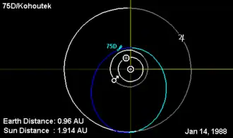 Not to be confused with the much better-known C/1973 E1 (Kohoutek), 75D is a repeat visitor to the inner Solar System, with a period of about seven years. It was placed on the discovery orbit when it passed 0.143 AU (21.4 million km) from Jupiter on 28 July 1972.[4][2] Apparitions have been dim, with the brightest being in 1988 at about apparent magnitude 13.[4] It was not seen in 1994, 2000, 2007, nor on its last predicted return in 2014. The comet has been estimated to be 4.6 km (2.9 mi) in diameter.[2]