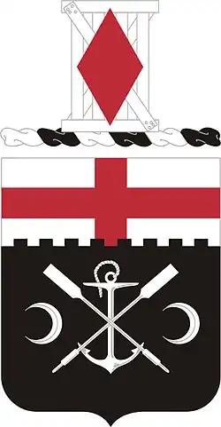 Black and white were the old colors of the Engineer Corps. The anchor and oars device was the badge of the Engineers and Pontoniers of the Army of the Potomac where the old units of the regiment did such gallant service. The crescents are the device of General Winfield Scott and represent the service of the old company in 1846–1848 in the Mexican War. In France, the regiment served with great gallantry in the 5th Division. The crossing of the Meuse near Dun is indicated by the device in chief of the shield which is not only a cross for the crossing of the river but the device of the lords of Dun.