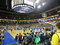 As the reigning German champion, Alba participated in the 2008–09 Euroleague. There, the team reached the Top 16, where it could not hold its ground against European elite clubs like FC Barcelona, Real Madrid, and Maccabi Tel Aviv. Yet, Alba had Europe's highest attendance at 11,264 spectators in the O2 World Berlin. In addition, the club gathered 14,800 spectators in the main round home game against Union Olimpija, a record crowd at a European Cup game in Germany. While at the national level in the cup final, Alba defeated Baskets Bonn. Later, Alba was beaten by the same team in the play-off semi-final series in five games.