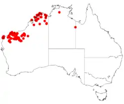Arid wattle to northern Western Australia, where it grows in red sandy loam or coarse, gravelly, skeletal sandy soils over laterite or sandstone in the Carnarvon, Central Kimberley, Gascoyne, Great Sandy Desert, Northern Kimberley, Ord Victoria Plain, Pilbara and Victoria Bonaparte bioregions.[7] It has a scattered, wide distribution within the Pilbara but generally does not dominate the vegetation. It sometimes form dense stands on many hilltops, called sky islands, particularly in the Hamersley Range and often grows in low, open Eucalypt woodland communities.[3]