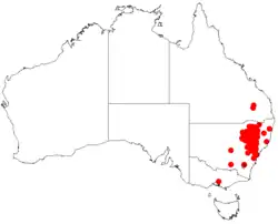 Motherumbah mainly occurs on the north-western plains and slopes of the Great Dividing Range in New South Wales and it also found near Murrurundi in the Hunter Valley region and west to the Warrumbungle Mountain and Pilliga Scrub, and north to Warialda and Torrington. There is also a population in the Glen Davis-Capertee district. It grows on rocky or stony hilltops and hillsides in skeletal or sandy soils in Eucalyptus woodland or scrubland.[2][3][4]