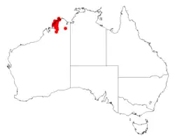 It is endemic to an area in the Kimberley region of Western Australia[1] where it is found on seasonally inundated flats with shallow skeletal alluvium overlying sandstone and dissected by outcropping sandstone ridges or in sandy soil around quartzite rocks alongside watercourses.[2]