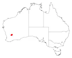 It is native to a small area in the Wheatbelt and Goldfields-Esperance regions of Western Australia where it is commonly situated on low granitic breakaways growing in gritty loam or sandy soils.[3] The range of the plant is only about 17 km (11 mi) containing three populations that is adjacent to the Chiddarcooping Nature Reserve with the Westonia and Nungarin Shires as a part of shrubland or open woodland communities containing species including Acacia andrewsii, Daviesia nematophylla, Eucalyptus yilgarnensis, Melaleuca uncinata and Austrodanthania setacea.[2]