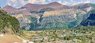 Akamina Ridge is composed of sedimentary rock laid down during the Precambrian to Jurassic periods. Formed in shallow seas, this sedimentary rock was pushed east and over the top of younger Cretaceous period rock during the Laramide orogeny.[5]