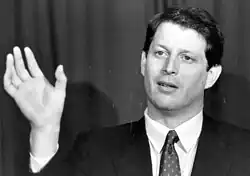 Age 39 at the time, Gore was described as the first serious young presidential candidate since John F. Kennedy in 1960. He was characterized as a political centrist aligned with many other Southern Democrats.[1] Despite eventual defeat, Gore, who came in a third place, was one of the front-runners that year. Al Gore, at that time, represented the Southern Democrats and some of the Conservative Democrats in 1980s.