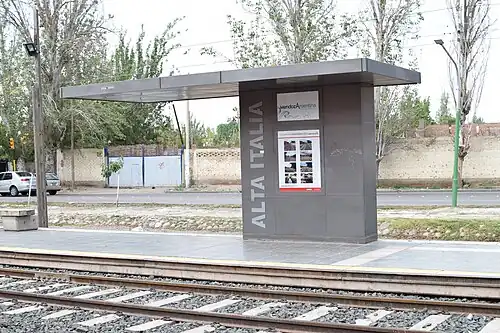 Alta Italia is a light rail station located on the intersection of Alta Italia and Hipólito Yrigoyen Streets in the town of General Gutiérrez, Maipú Department, Mendoza Province, Argentina. The station opened on 28 February 2012, as part of Metrotranvía Mendoza.