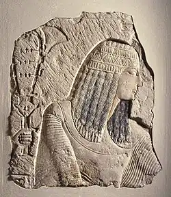 Egyptian society was highly stratified, and social status was expressly displayed. Farmers made up the bulk of the population, but agricultural produce was owned directly by the state, temple, or noble family that owned the land.[76] Farmers were also subject to a labor tax and were required to work on irrigation or construction projects in a corvée system.[77] Artists and craftsmen were of higher status than farmers, but they were also under state control, working in the shops attached to the temples and paid directly from the state treasury. Scribes and officials formed the upper class in ancient Egypt, known as the "white kilt class" in reference to the bleached linen garments that served as a mark of their rank.[78] The upper class prominently displayed their social status in art and literature. Below the nobility were the priests, physicians, and engineers with specialized training in their field. It is unclear whether slavery as understood today existed in ancient Egypt; there is difference of opinions among authors.[79]