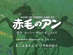 Anne of Green Gables (Japanese: 赤毛のアン, Hepburn: Akage no An; lit. 'Red-haired Anne') is a Japanese animated television series and the fifth entry in Nippon Animation's World Masterpiece Theater franchise. It was adapted from the 1908 novel Anne of Green Gables by Lucy Maud Montgomery. Produced by Nippon Animation in 1979, it was first broadcast on Fuji TV from January 7 to December 30. Fifty episodes were produced in total.[1] The first six episodes were later edited into a compilation film released in 2010.