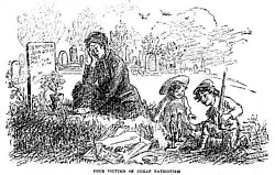 Four Victims of Cheap Patriotism (1910). Anti-war cartoon depicting a widow grieving the death of her husband alongside their children playing with a toy rifle and soldiers.