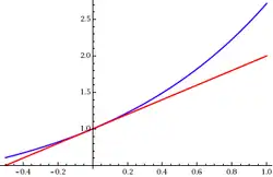 Graph of (blue) with its linear approximation (red) at a = 0. The approximation error, visually represented as the vertical gap between the two curves, demonstrably increases for values of x that are positioned further from the point of approximation, which in this case is x = 0.
