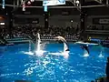 Since partnering with Epson and Maxell, aquariums have incorporated projection mapping into entrance hall and dolphin shows.[19] The Stadium has 1,350 seats, and there are shows by Pacific white-sided dolphins, bottlenose dolphins, and false killer whales that make full use of technology such as water curtains. [20][21] Also, the dolphin show at The Stadium is different day and night.[22]