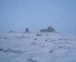 The summit itself is known as Carnedd Bachgen, named after the ancient cairn, Carnedd y Bachgen (which lies just north-east of the summit), and is the highest point at the north end of a wide plateau. There is a trig point and a substantial shelter cairn. The mountain rises from the Migneint moorland and looks like a bulky heathery "lump" from most directions. However, its north-eastern face has steep cliffs with a small corrie lake, Llyn Arenig Fach, at their bottom.[1] The last glacier occupation of this corrie is thought to have happened during the Loch Lomond Stadial.[2]