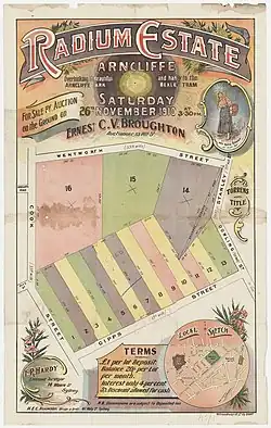 Alderman E.G. Barton worked to develop the district, including the reclamation 120 acres (0.49 km2) of swampland where Barton Park and Kogarah Golf Links now stand. James Beehag also owned land in the area and later became one of Rockdale's early mayors. In November 1910, a series of lots were auctioned by Ernest V. Broughton. The area, bordered by Wentworth, Cook and Dowling streets was called the 'Radium Estate' and had been surveyed by E. R. Hardy.