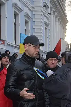 Arseniy Petrovych Yatsenyuk[a][b] (born 22 May 1974) is a Ukrainian politician, economist and lawyer who served two terms as Prime Minister of Ukraine – from 27 February 2014 to 27 November 2014 and from 27 November 2014 to 14 April 2016.[1] He was the youngest foreign affairs minister in Ukraine's history. Arseniy Yatsenyuk holds a diplomatic rank of Extraordinary and Plenipotentiary Ambassador.[2]