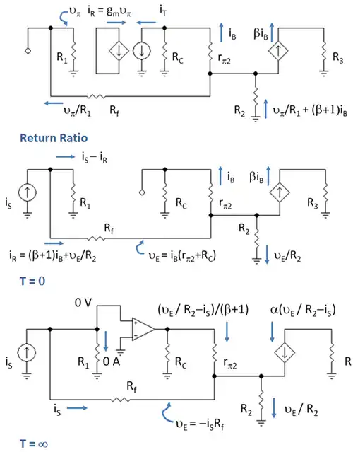 The circuit to determine G∞ is shown in the bottom panel of Figure 7. The introduction of the ideal op amp (a nullor) in this circuit is explained as follows. When T → ∞, the gain of the amplifier goes to infinity as well, and in such a case the differential voltage driving the amplifier (the voltage across the input transistor rπ1) is driven to zero and (according to Ohm's law when there is no voltage) it draws no input current. On the other hand, the output current and output voltage are whatever the circuit demands. This behavior is like a nullor, so a nullor can be introduced to represent the infinite gain transistor.