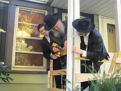 Rabbi Bromberg affixing a Biblically mandated gate on his porch.