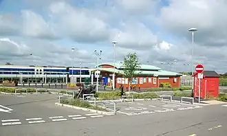 Aylesbury Vale Parkway station, showing the taxi rank (left), cycle shelter (centre) and booking hall (right) | |||||