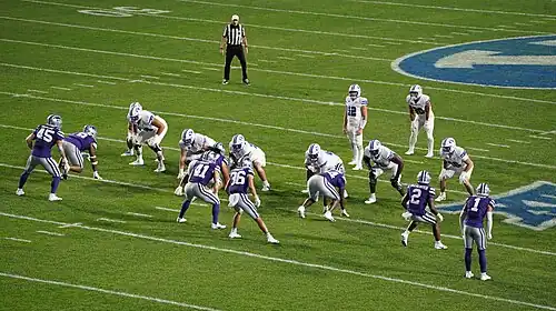 With the hiring of Kalani Sitake as head coach at the end of 2015, BYU has seen the gradual return of wearing royal blue combinations. They initially only made appearances in rivalry and other campus event games, but from 2017 onward, they have been worn more regularly. In 2019, several new combinations were introduced, including an all-white combination with royal accents,[43] and a variation on the "away" combination with some styling changes to pay tribute to the uniforms of the 1960s.[44] This last alternate uniform was accompanied by a throwback midfield logo and an endzone paint scheme that matched the field design used by BYU in the 1960s. A more modern design of the retro combination appeared in a game at the end of the season at San Diego State.