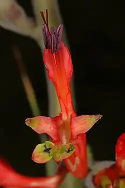 The many mirror-symmetrical flowers have no smell, are upright, facing outwards and crowded on several ascending branches, and consist of a merged, narrowly funnel-shaped perianth tube at the base of 30–40 mm (1.2–1.6 in) long and six separate tepal lobes, grouped in an upper (consisting of the three dorsal tepals) and lower lip (comprising the remaining three lower tepals). Most of the flower is bright scarlet in colour, but the lower tepals have a yellow blotch, marked with dark green near its base. The dorsal tepal is 16–20 mm (0.63–0.79 in) long, upright, with the edges curled inwards, enclosing parts of the filaments of the three stamens and merged with the lateral dorsal tepals about 6 mm (0.24 in) higher than the higher lateral tepals with the lower lateral tepals. The upper and lower tepals are about 8 mm (0.31 in) long. The stamens have straight filaments of 37–40 mm (1.5–1.6 in) long and reach beyond the tip of the dorsal tepal. The inferior ovary is hairless and carries a style that splits into three branches opposite the lower half of the anthers; the branches are about 4 mm (0.16 in) long. Flowering occurs between July and October.[1]