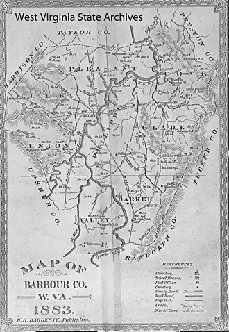 In 1863, West Virginia's counties were divided into civil townships, with the intention of encouraging local government. This proved impractical in the heavily rural state, and in 1872 the townships were converted into magisterial districts.[28] Barbour County's original magisterial districts were Barker, Cove, Elk, Glade, Philippi, Pleasant, and Union. Between 1880 and 1890, part of Barker District was split off to form Valley District. These eight districts continued until the 1970s, when they were consolidated into three districts: North, South, and West.[29]