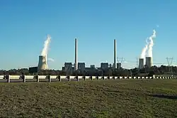 Carbon Monitoring for Action estimates this power station emits 19.80 million tonnes of greenhouse gases each year as a result of burning coal.[3] In 2010 the Australian Government announced the introduction of a Carbon Pollution Reduction Scheme to help combat climate change. It is expected to impact on emissions from power stations. The National Pollutant Inventory provides details of a range of pollutant emissions, including CO, estimated at 1,600,000 kilograms (3,500,000 lb) for the year ending 30 June 2011.[4]