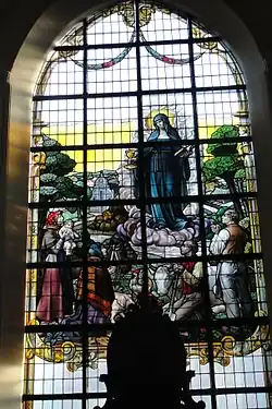 Stained glass window of Saint Berlindis in Sint-Pieter en Sint-Berlindiskerk, in Meerbeke, Belgium