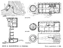 The whole complex consists of three major features that could be considered as separate structure connected together: a tower, a main building, and smaller service attachment. Biały Słoń had five stories facing the Czechoslovakian side (today Zakarpattia Oblast), and two stories facing the Polish side (today Ivano-Frankivsk Oblast).[6] The whole complex was built mostly from local sandstone.[6] Due to lack of roads, the construction materials were brought by horses, or either by hand or on the backs of local Hutsuls and soldiers of the 49th Hutsul Rifle Regiment from the Vorokhta train station located some 70 km (43 mi) away.[6][5] The walls of a lower attachment and the semi-basement floor have a thickness of 1.5 m (4.9 ft), while upper floors - 1 m (3.3 ft).[6] The roof of a building was covered with copper sheets.[6] On the southern side there was a rotunda on which a telescope was located.[6] The copper dome of the telescope opened automatically.[6]