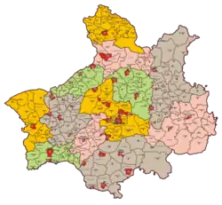 Starting with the elections in 1922, there were 18 parliamentary mandates up for grabs in the voivodeship in four slightly changed constituencies. The results of these elections gave a more diversified picture of the political composition of the province. The dominance of right-wing groups was no longer as clear, although the Christian Union of National Unity lists won 11 mandates. The Christian Democratic groups won five seats, the Bloc of National Minorities won four (of which three were Belarusians and one Jew), and the PSL "Piast" won two. The May Coup in 1926 and Piłsudski's return to power caused a temporary increase in the influence of left-wing groups and a decrease in the popularity of the right.[11] Despite the pressure from the Sanation camp, by the end of the thirties the three largest opposition parties still had quite a strong influence: the National Party in the western part of the province, the People's Party in the northern part (Suwałki Region) and the Polish Socialist Party in larger cities, Białystok, Bielsk Podlaski and Grodno.[12]