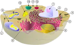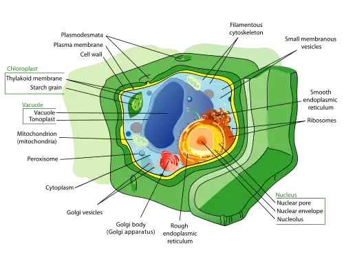 Within the cytoplasm of a cell, there are many biomolecules such as proteins and nucleic acids.[40] In addition to biomolecules, eukaryotic cells have specialized structures called organelles that have their own lipid bilayers or are spatially units.[41] These organelles include the cell nucleus, which contains most of the cell's DNA, or mitochondria, which generate adenosine triphosphate (ATP) to power cellular processes. Other organelles such as endoplasmic reticulum and Golgi apparatus play a role in the synthesis and packaging of proteins, respectively. Biomolecules such as proteins can be engulfed by lysosomes, another specialized organelle. Plant cells have additional organelles that distinguish them from animal cells such as a cell wall that provides support for the plant cell, chloroplasts that harvest sunlight energy to produce sugar, and vacuoles that provide storage and structural support as well as being involved in reproduction and breakdown of plant seeds.[41] Eukaryotic cells also have cytoskeleton that is made up of microtubules, intermediate filaments, and microfilaments, all of which provide support for the cell and are involved in the movement of the cell and its organelles.[41] In terms of their structural composition, the microtubules are made up of tubulin (e.g., α-tubulin and β-tubulin) whereas intermediate filaments are made up of fibrous proteins.[41] Microfilaments are made up of actin molecules that interact with other strands of proteins.[41]