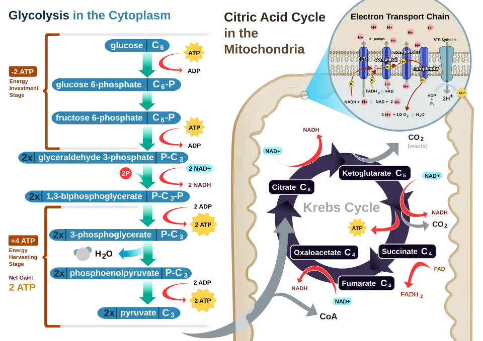 Sugar in the form of glucose is the main nutrient used by animal and plant cells in respiration. Cellular respiration involving oxygen is called aerobic respiration, which has four stages: glycolysis, citric acid cycle (or Krebs cycle), electron transport chain, and oxidative phosphorylation.[43] Glycolysis is a metabolic process that occurs in the cytoplasm whereby glucose is converted into two pyruvates, with two net molecules of ATP being produced at the same time.[43] Each pyruvate is then oxidized into acetyl-CoA by the pyruvate dehydrogenase complex, which also generates NADH and carbon dioxide. Acetyl-CoA enters the citric acid cycle, which takes places inside the mitochondrial matrix. At the end of the cycle, the total yield from 1 glucose (or 2 pyruvates) is 6 NADH, 2 FADH2, and 2 ATP molecules. Finally, the next stage is oxidative phosphorylation, which in eukaryotes, occurs in the mitochondrial cristae. Oxidative phosphorylation comprises the electron transport chain, which is a series of four protein complexes that transfer electrons from one complex to another, thereby releasing energy from NADH and FADH2 that is coupled to the pumping of protons (hydrogen ions) across the inner mitochondrial membrane (chemiosmosis), which generates a proton motive force.[43] Energy from the proton motive force drives the enzyme ATP synthase to synthesize more ATPs by phosphorylating ADPs. The transfer of electrons terminates with molecular oxygen being the final electron acceptor.