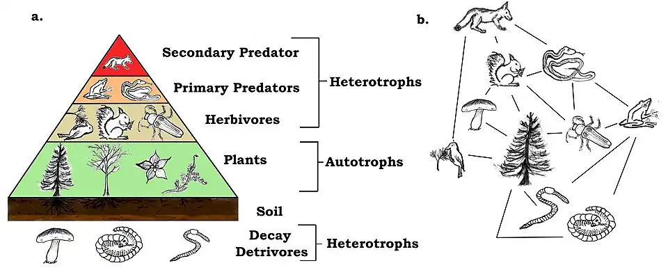 A community is a group of populations of species occupying the same geographical area at the same time.[153] A biological interaction is the effect that a pair of organisms living together in a community have on each other. They can be either of the same species (intraspecific interactions), or of different species (interspecific interactions). These effects may be short-term, like pollination and predation, or long-term; both often strongly influence the evolution of the species involved. A long-term interaction is called a symbiosis. Symbioses range from mutualism, beneficial to both partners, to competition, harmful to both partners.[154] Every species participates as a consumer, resource, or both in consumer–resource interactions, which form the core of food chains or food webs.[155] There are different trophic levels within any food web, with the lowest level being the primary producers (or autotrophs) such as plants and algae that convert energy and inorganic material into organic compounds, which can then be used by the rest of the community.[47][156][157] At the next level are the heterotrophs, which are the species that obtain energy by breaking apart organic compounds from other organisms.[155] Heterotrophs that consume plants are primary consumers (or herbivores) whereas heterotrophs that consume herbivores are secondary consumers (or carnivores). And those that eat secondary consumers are tertiary consumers and so on. Omnivorous heterotrophs are able to consume at multiple levels. Finally, there are decomposers that feed on the waste products or dead bodies of organisms.[155] On average, the total amount of energy incorporated into the biomass of a trophic level per unit of time is about one-tenth of the energy of the trophic level that it consumes. Waste and dead material used by decomposers as well as heat lost from metabolism make up the other ninety percent of energy that is not consumed by the next trophic level.[158]