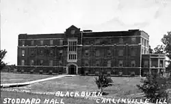 Blackburn College was established in 1837 and named for the Rev. Gideon Blackburn, a Presbyterian minister who helped raise funds for the school.[4] By 1855, instruction began at the college. Within two years (1857), the school was chartered as "Blackburn Theological Seminary",[4] and the first unit of University Hall was erected.[4] By 1862, several buildings had been developed for study on campus including space for the "Blackburn Academy", an organization for a campus grade and high school.[4] From 1837 until 1864, the school only admitted male students.[4] The first woman attended Blackburn in 1864, thereby sparking the movement of admitting female students. Also in 1864, the school was recognized and established as a four-year institution.[4]